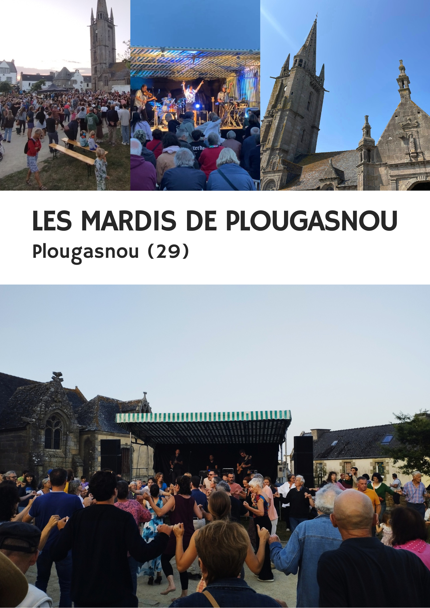Nous assurons la programmation de concerts estivaux à Plougasnou. Les mardis soir, la Place de l’Église se transforme en véritable lieu de fête : une scène, deux concerts par soirée, pour le plaisir des petits et des grands. Ces rendez-vous musicaux rassemblent habitants et vacanciers, qui n’hésitent pas à venir partager un moment convivial et danser ensemble.